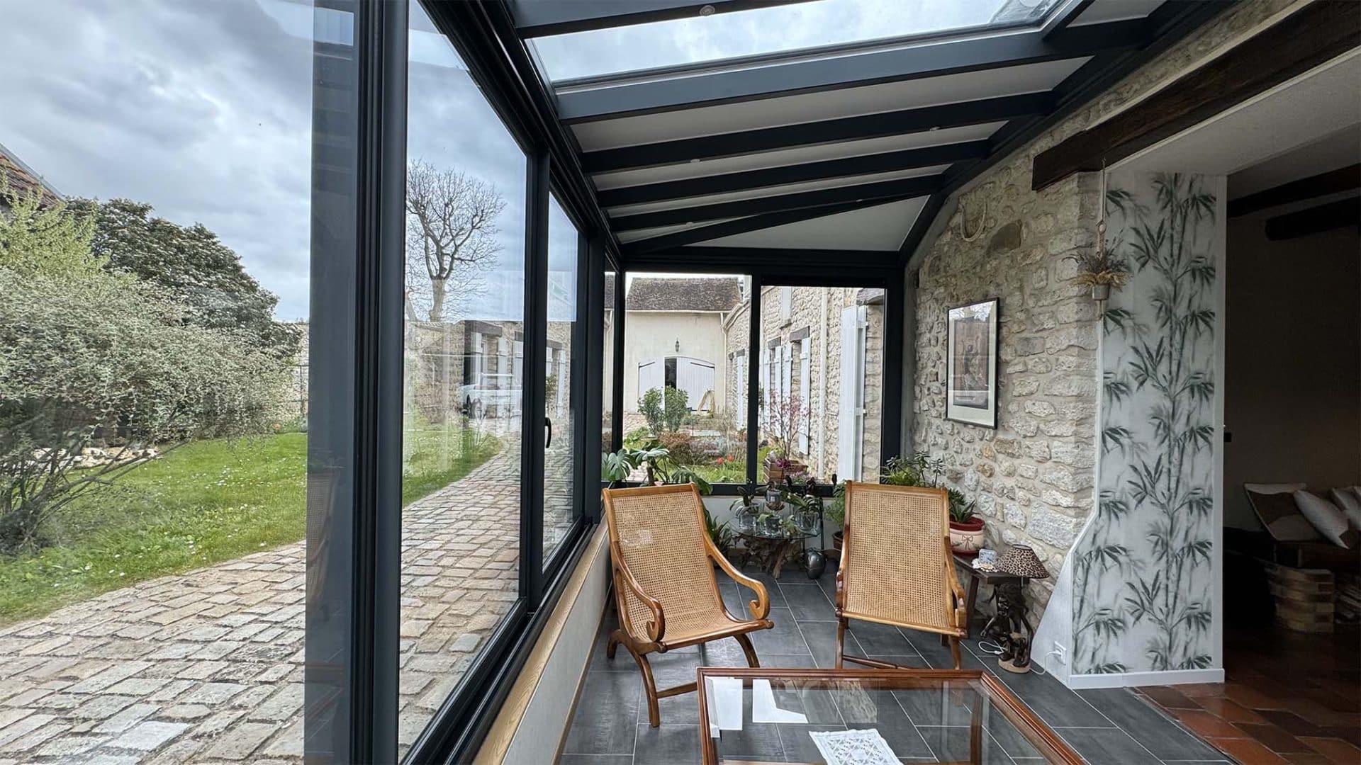 La véranda se fond dans le cadre rustique de la maison tout en y ajoutant une touche contemporaine. À l’intérieur, l’aménagement spacieux en fait un véritable salon d’hiver, propice à la relaxation. Le choix de matériaux haut de gamme et l’isolation thermique et acoustique permettent de profiter de cet espace en toute saison. Les propriétaires peuvent désormais se détendre en toute tranquillité en admirant la vue sur le jardin.