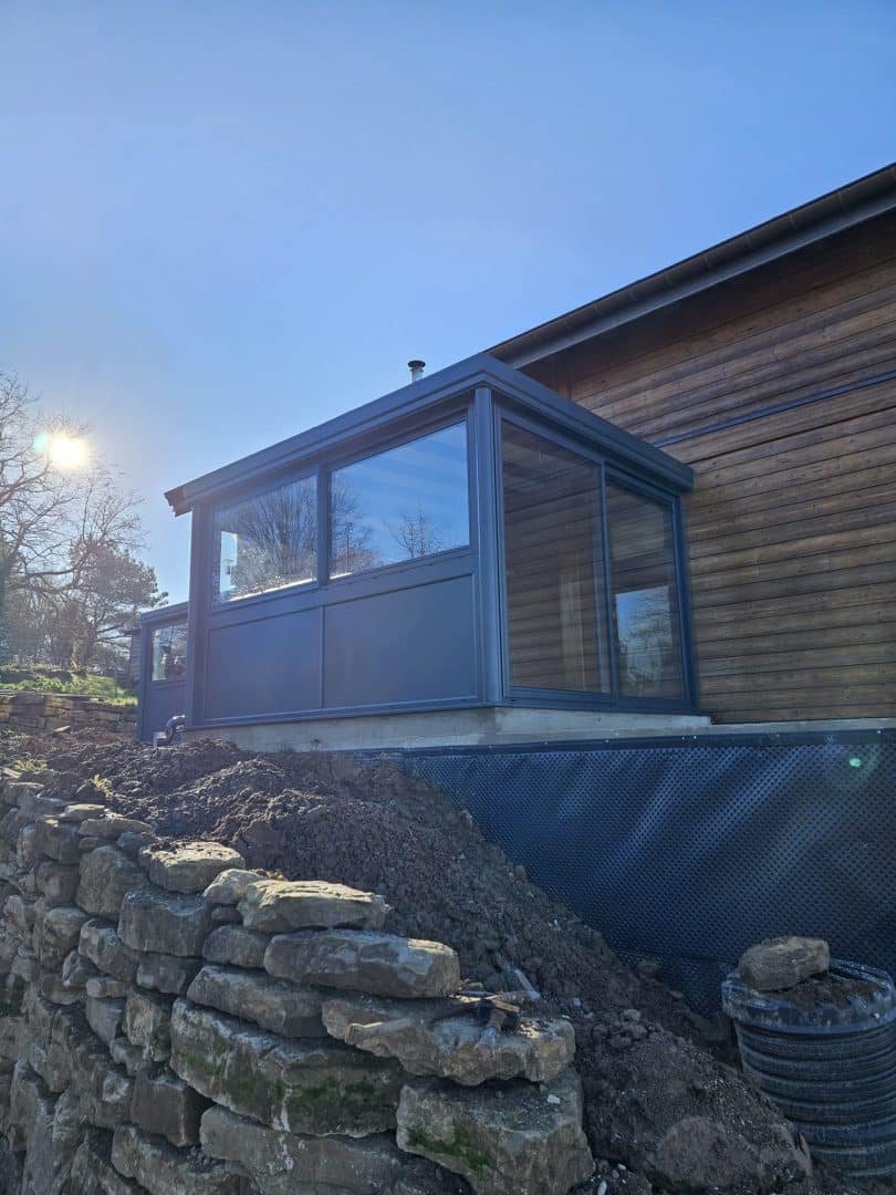 Cette petite véranda au design moderne et épuré s’intègre parfaitement à la façade en bois de la maison, offrant un contraste élégant grâce à sa structure en aluminium gris anthracite. Conçue sur mesure par Le vérandier By TRYBA alsace, elle maximise l’apport de lumière naturelle grâce à ses baies vitrées tout en optimisant l’isolation thermique. Idéalement positionnée, elle permet de créer un espace de vie supplémentaire tout en mettant en valeur le charme rustique de la pierre du mur extérieur.