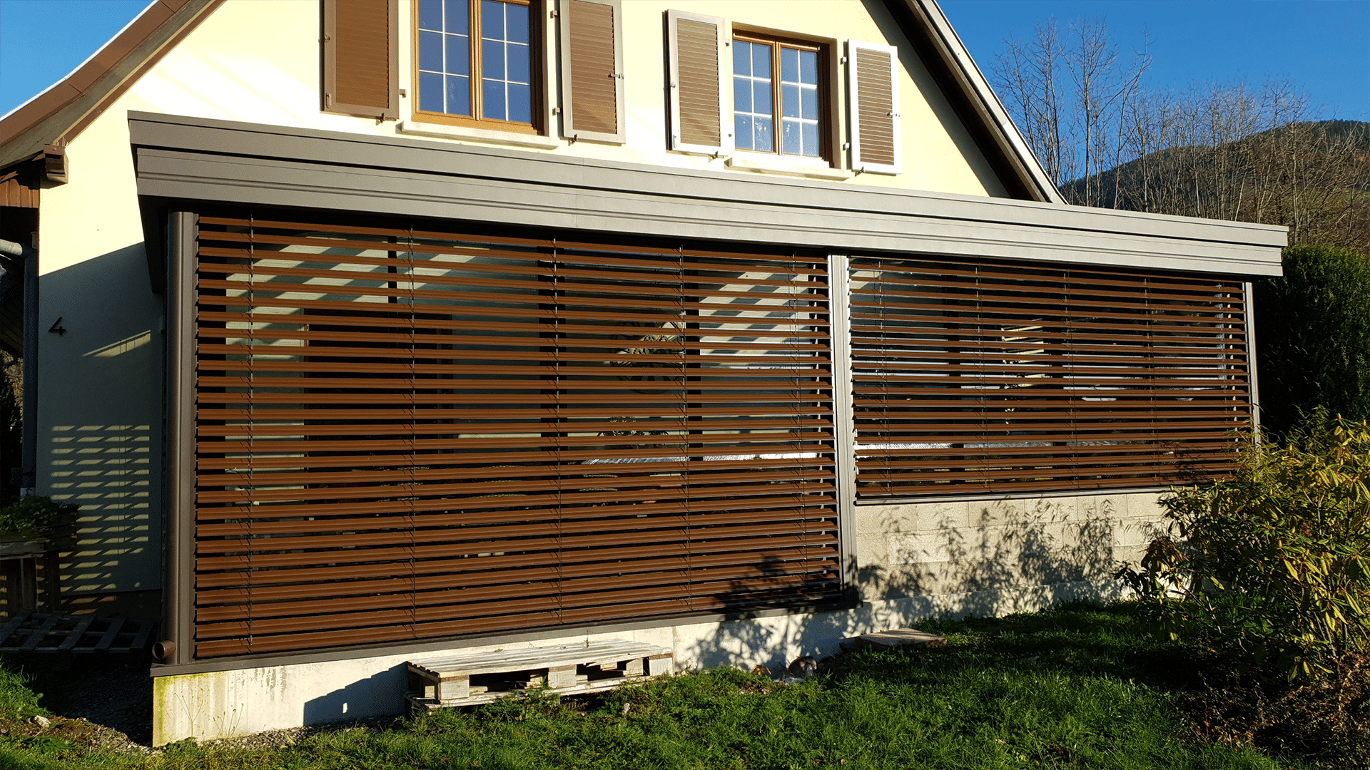- Finitions : Allège en muret, Spots LED, Finition coffre, toiture opaque et vitrée, Brises soleils orientables, puits de lumière